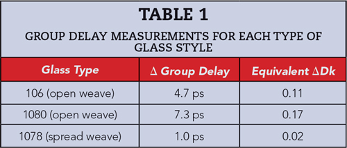 A laminate with filler, which is usually a different Dk than the glass and the resin system, will help to minimize the Dk transitions between the glass fabric and the resin system (see Figure 7). Smoothing the Dk transitions is helpful for reducing the glass-weave effect; however, the effect can still be observed, although to a lesser extent than unfilled glass reinforced laminates.Table 3 shows test results for 1080 glass with laminate unfilled vs. filled, proving that a ceramic filled laminate significantly reduces the glass-weave effect on skew. Further to this improvement, RO4835TTM (a ceramic loaded thermoset similar to 4835 LoPro) and XtremeSpeed GB series© (a ceramic loaded PTFE) use advanced glass material specifically for high-speed, low-loss digital applications. These materials are constructed with spread glass 1078 and 1035 to further even the Dk distribution in the XY plane.