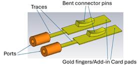 Fig. 2. 3D model showing port setup on Add-in Card side with traces, mated connector pins and pads.
