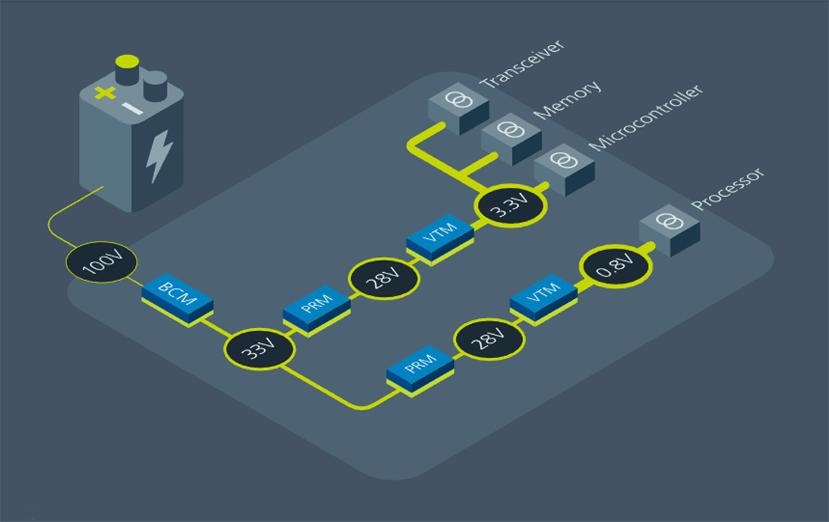 Current multiplication separates the functions of DC-DC conversion into independent power modules. The Vicor rad-tolerant topology splits the power conversion task into three sections: voltage transformation and isolation (BCM), load voltage regulation (PRM) and power delivery (VTM). This configuration reduces the last-centimeter copper losses and allows layout engineers more flexibility in placing modules where space is available.