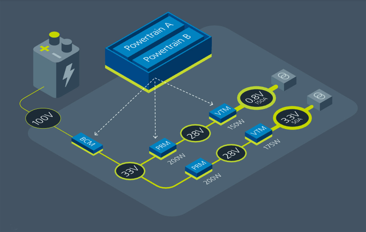 The AI1 chain looks different. A rad-tolerant BCM takes the 100 V bus and delivers up to 400 W at an intermediate voltage at one-third the input (33 V), with enough headroom to drive two PRM: VTM rails at 150 W each. Each PRM regulates its own 33 V-class intermediate node; each VTM then converts to the appropriate point of load voltage. At 300 W total, the 33 V distribution bus carries only about 9 A instead of 25 A. With the same 10 mΩ effective path resistance, I²R loss falls to roughly 0.8 W and the DC drop to about 0.09 V — less than 0.3% of the intermediate voltage. That is roughly a 5 to 8× reduction in distribution loss and a meaningful recovery of voltage margin, gained purely by moving the heavy lifting to a higher voltage, lower current domain.